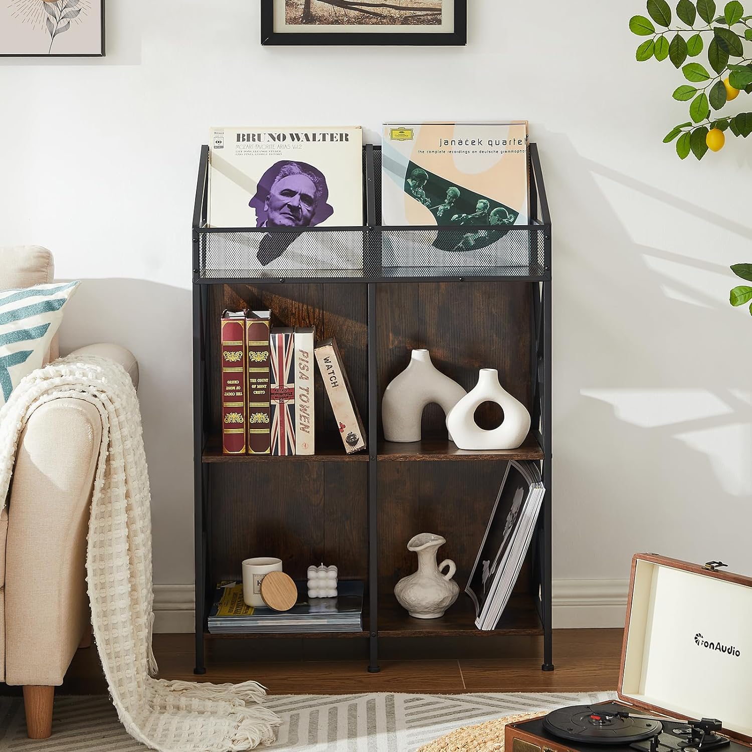 6 Grids Vinyl Record Storage Holder Rack, Wooden Record Display Table for Magazines Files Albums Books for Living Room Bedroom Patent Pending