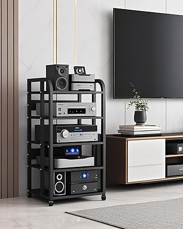7-Tier AV Media Stand, Audio Rack Stereo Cabinet, Adjustable Media Storage Shelves with Wheels, CD Player Video Game Console Shelf Entertainment Component Stand(A)