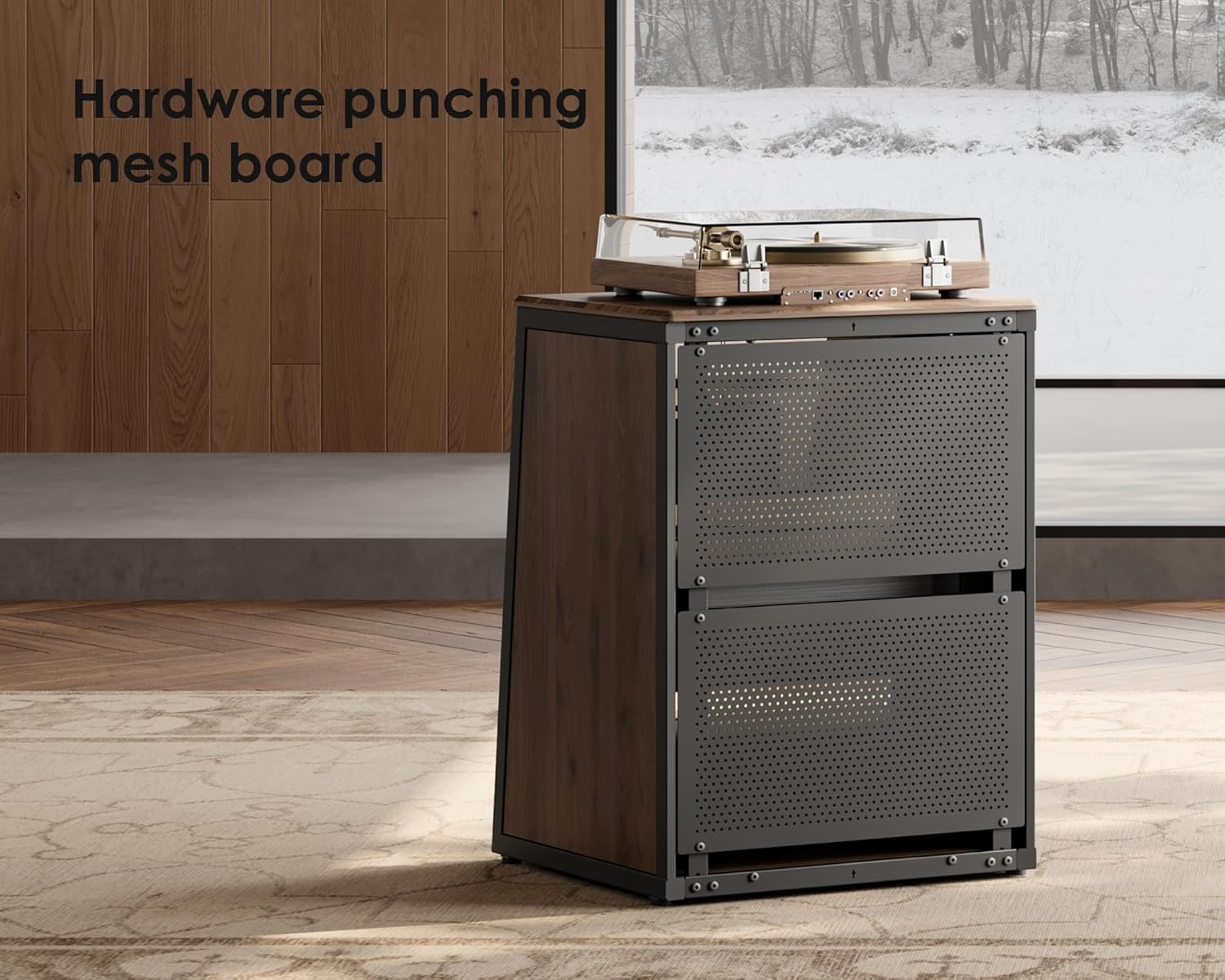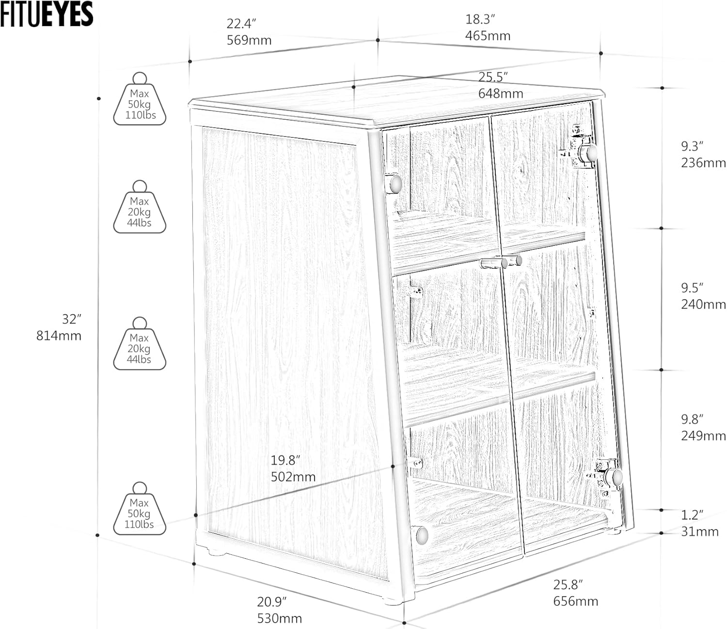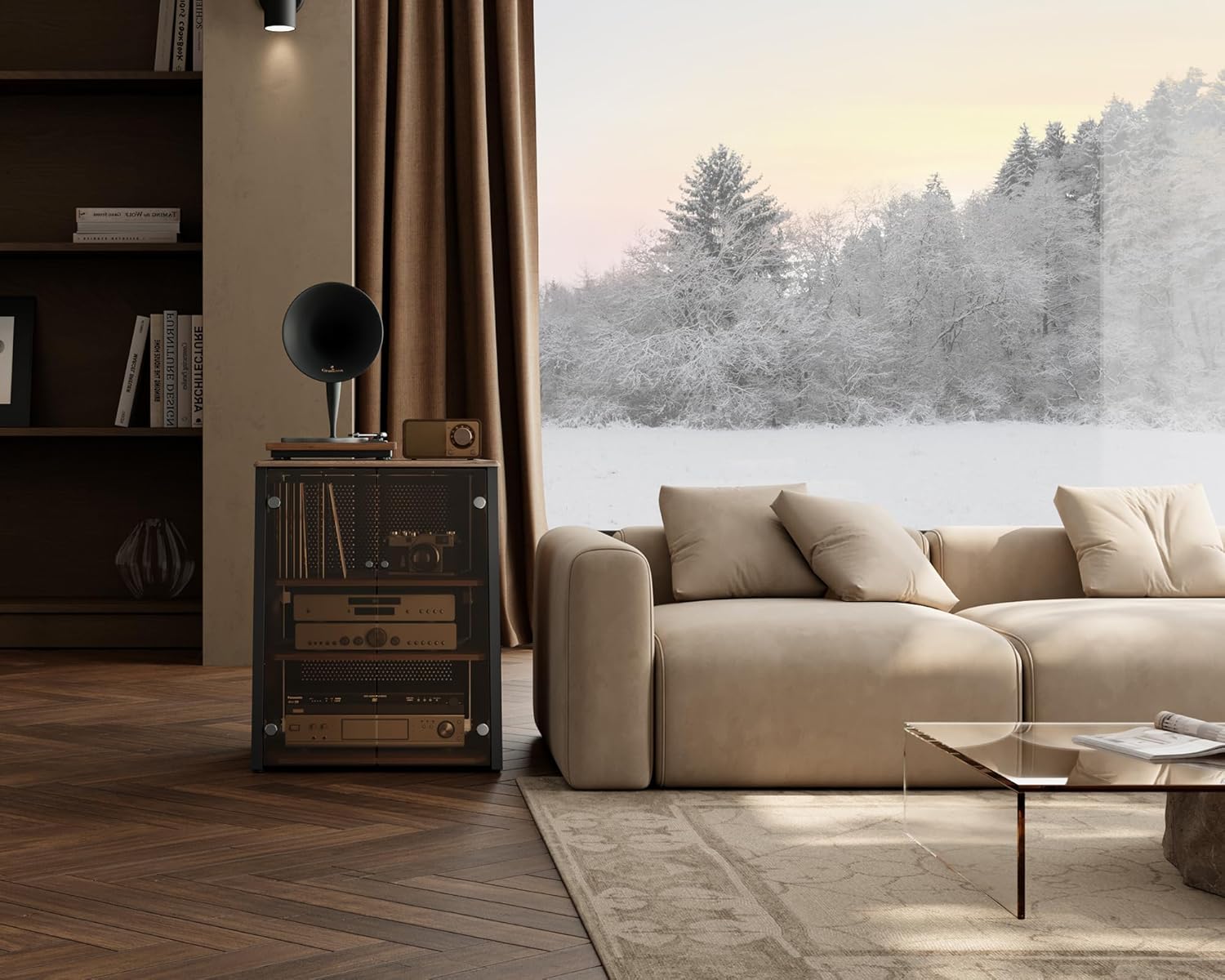 FITUEYES Design 4-Tier Media Stand with Brown Glass Doors Audio Rack with Adjustable Shelves Stereo Cabinet Protection Equipment for Vinyl Record Player Stereo Receivers Audio Gear, Eiffel Series