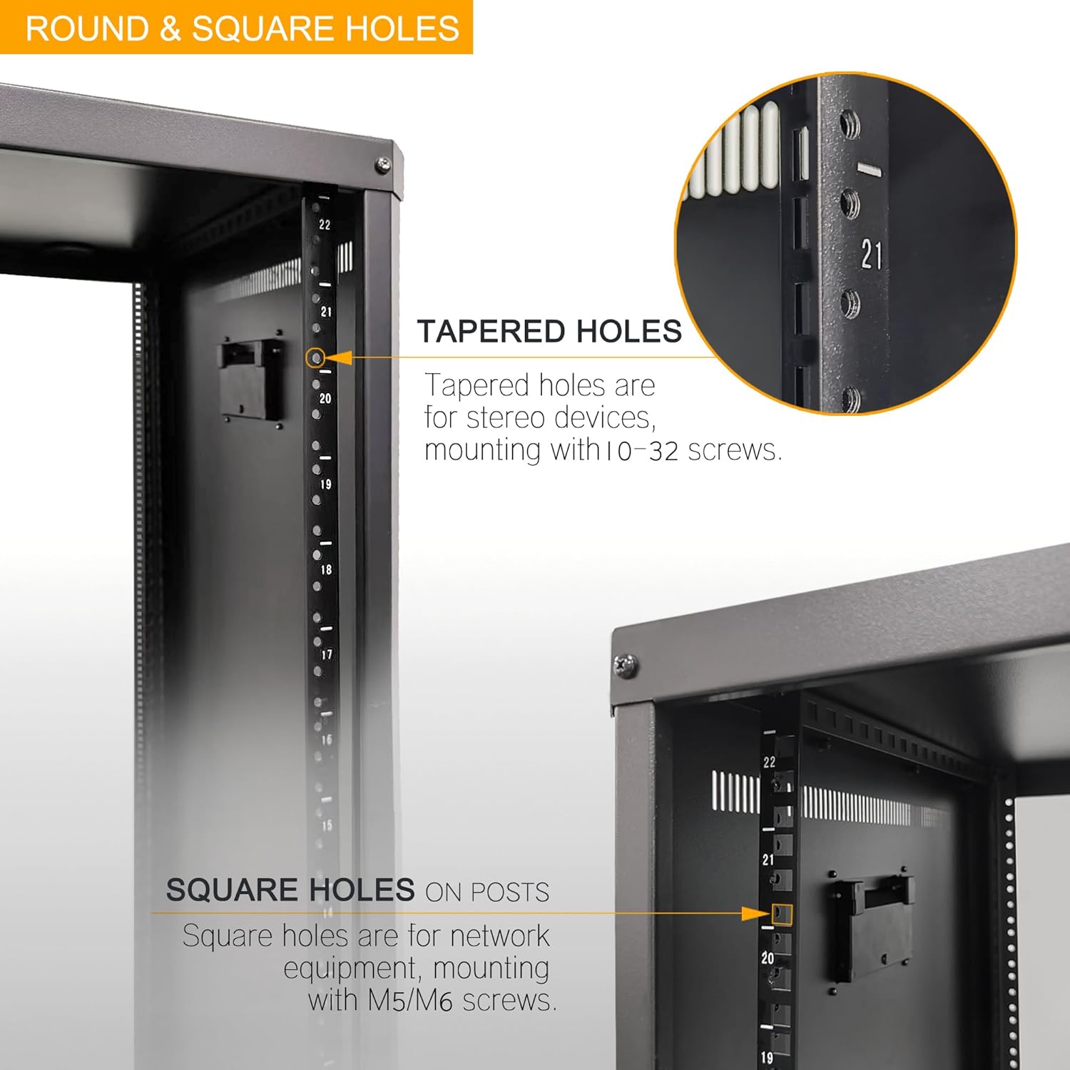 It is with two types of mounting holes on each post: round holes are for sound equipment EURO 5mm, US 6mm screws, and square holes are compatible with 19” network equipment with M5/ M6 screws & cage nuts.