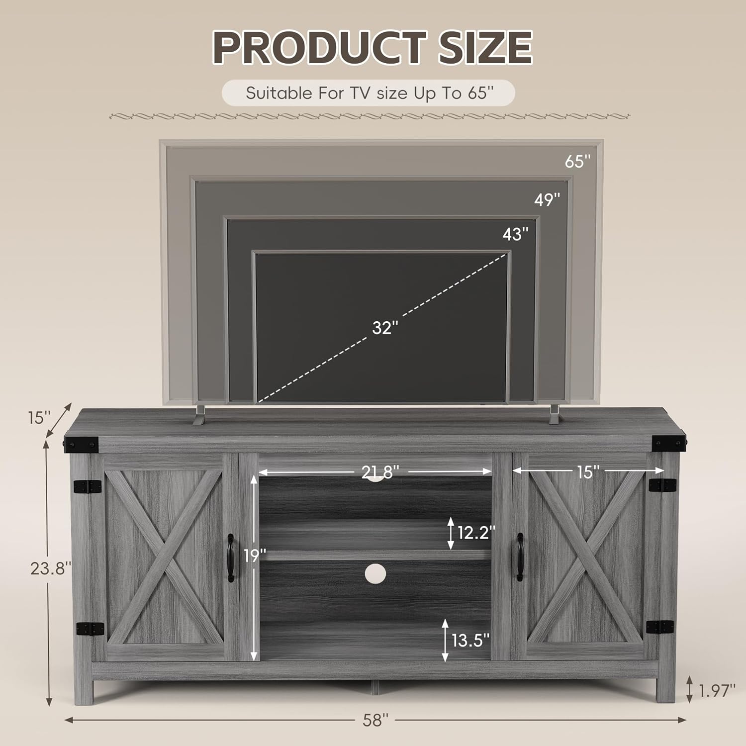 TV stand is 24” H x 15.75” D x 58” L for TVs up to 65 Inches