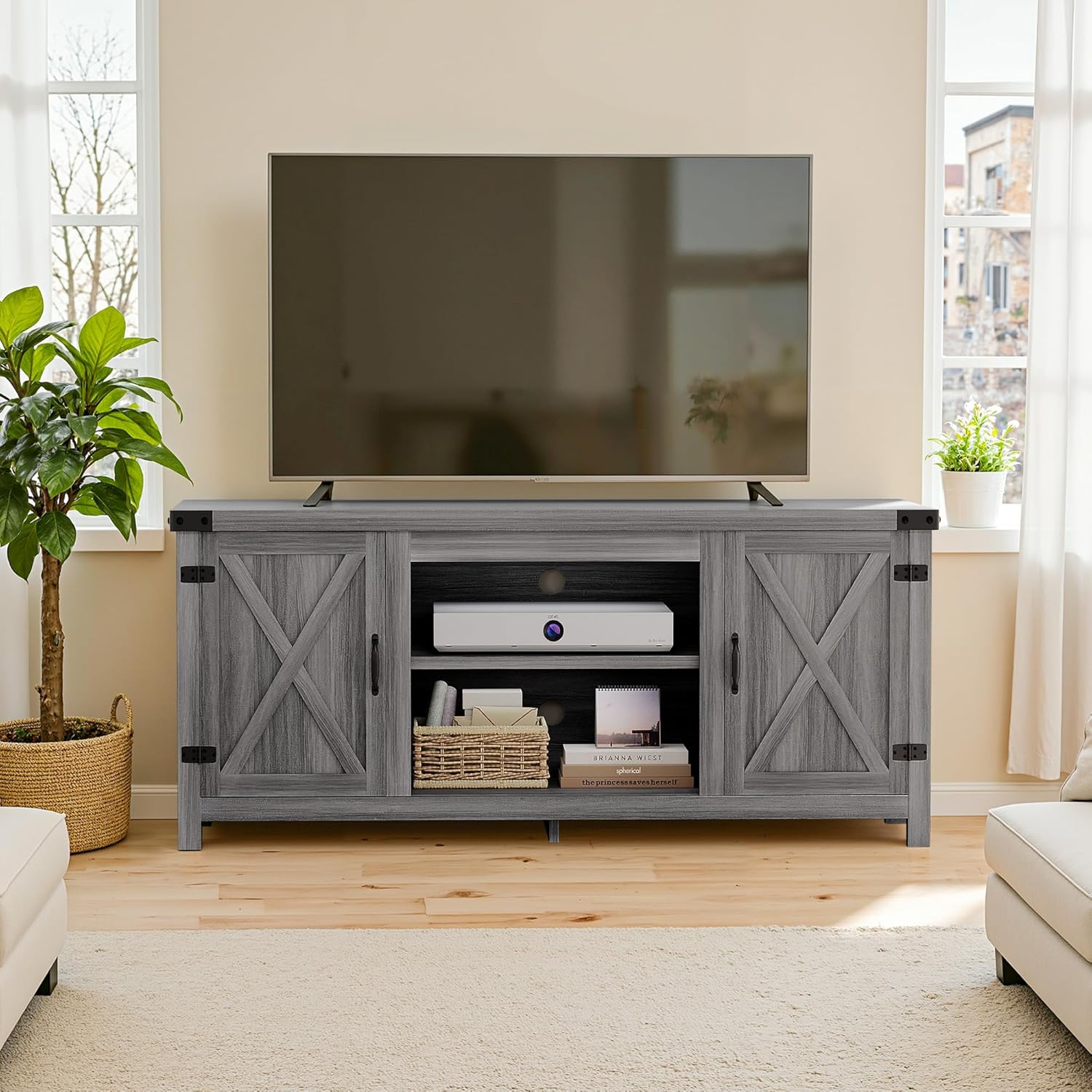 YESHOMY Modern Farmhouse TV Stand with Two Barn Doors and Storage Cabinets for Televisions up to 65+ Inch,Entertainment Center Console Table,Media Furniture for Living Room, Grey